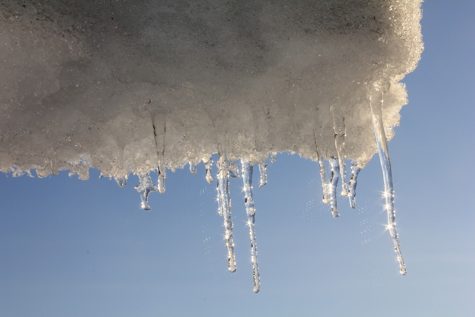 Utenfor stuevinduet henger det fra taket og solen skinner i istappene.